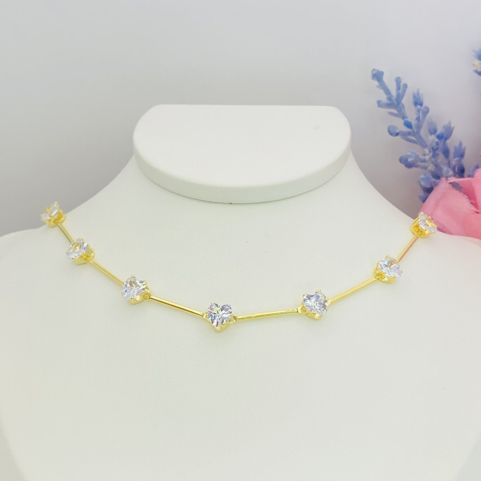 Choker banhada a ouro 18k (4 milésimos) + verniz italiano, com pingentes de coração 6mm em zircônia.