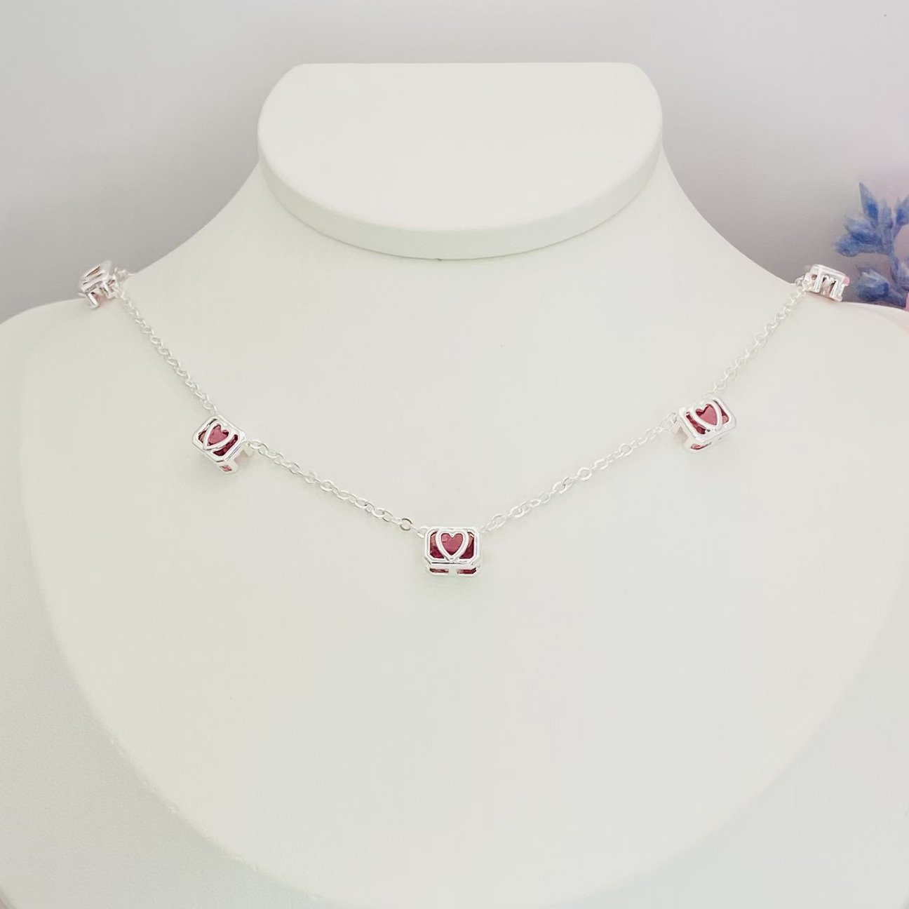 Choker cadeadinho banhada a prata 925 (70 milésimos) + verniz italiano, com pingentes de corações rosa.