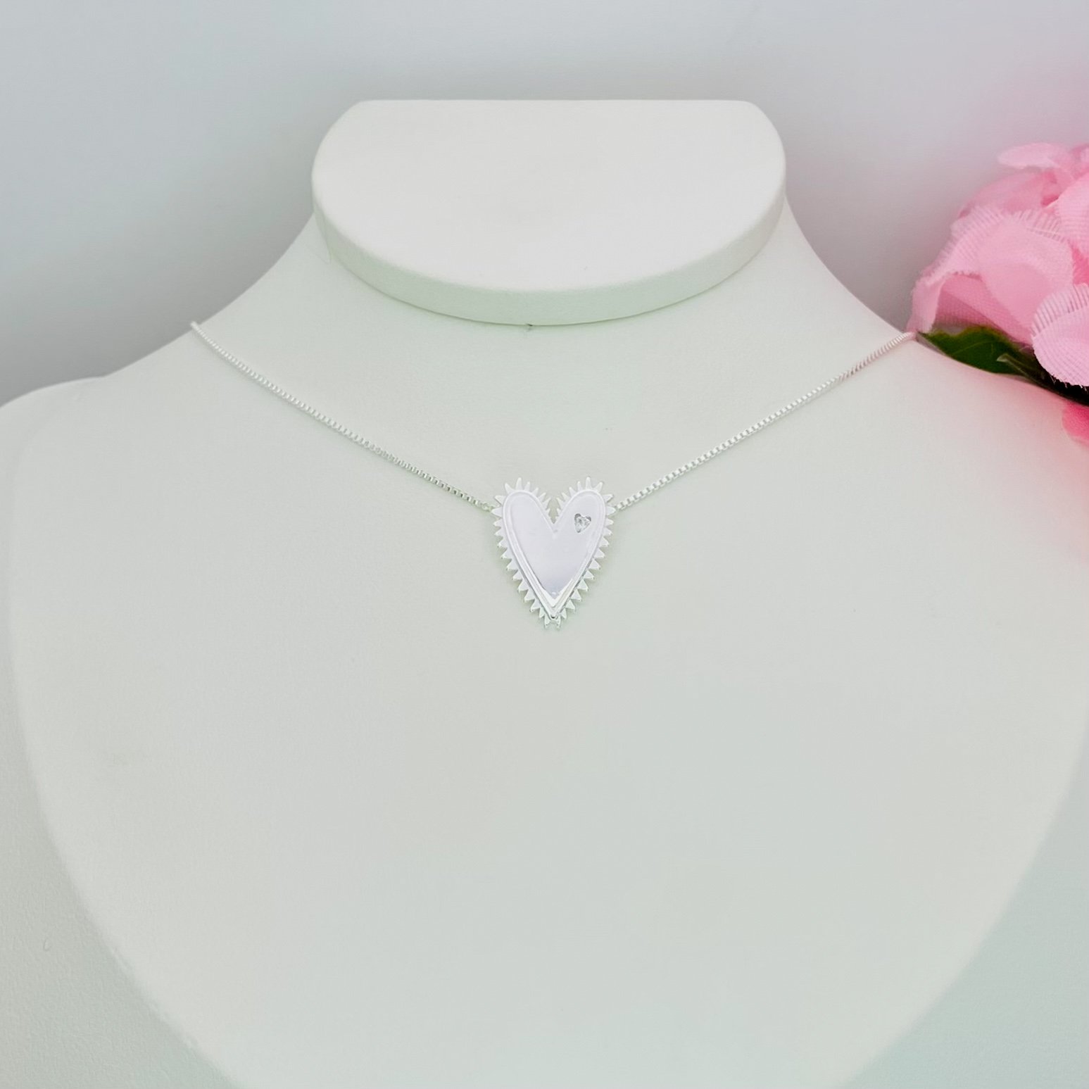 Colar bipartido banhado a prata 925 (70 milésimos) + verniz italiano, com pingente de coração cravejado com micro zircônia.Medida do colar: 22 cm (cada lado) + 5cm de extensor