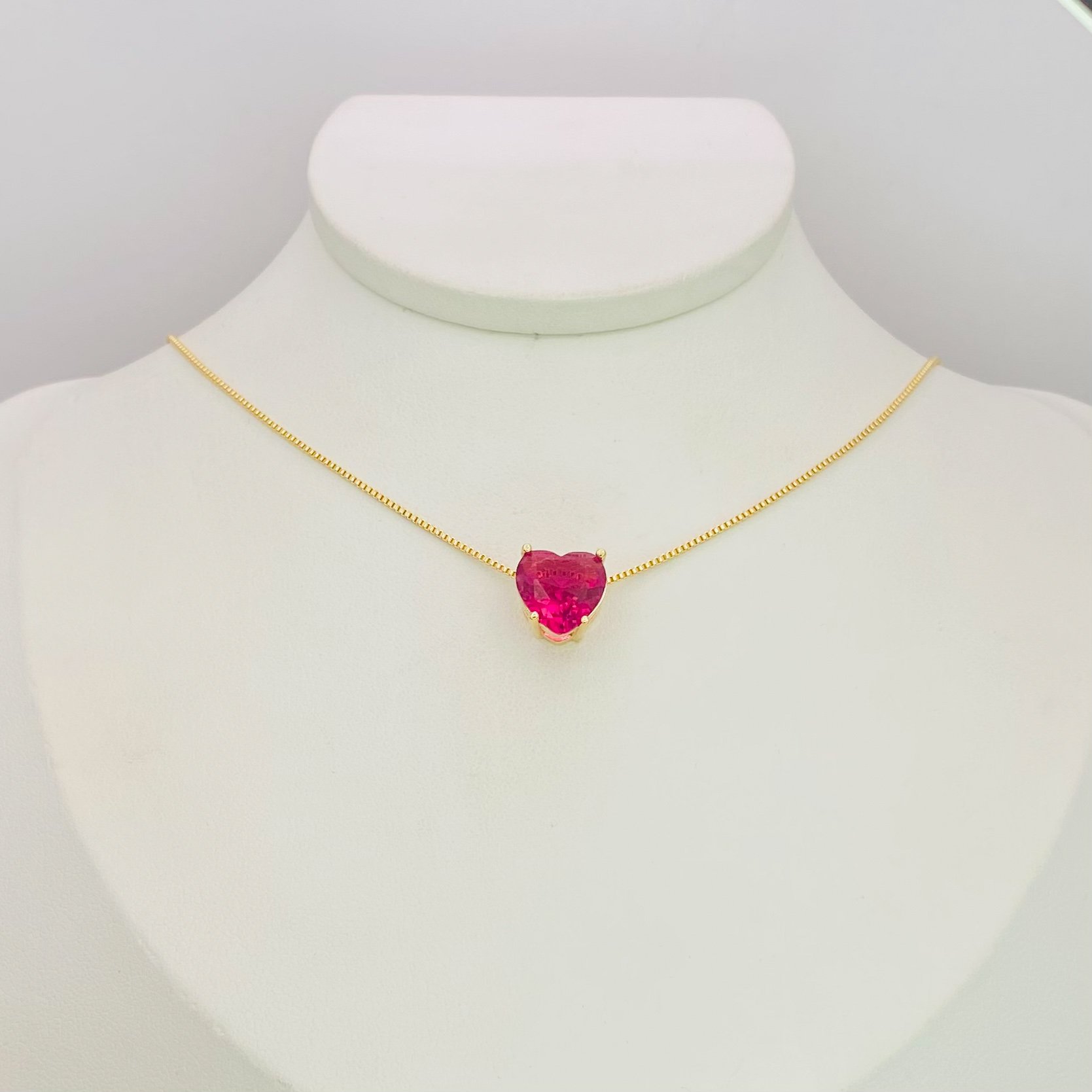 Colar banhado a ouro 18k (4 milésimos) + verniz italiano, com pingente transpassado de coração 10mm rosa pink.