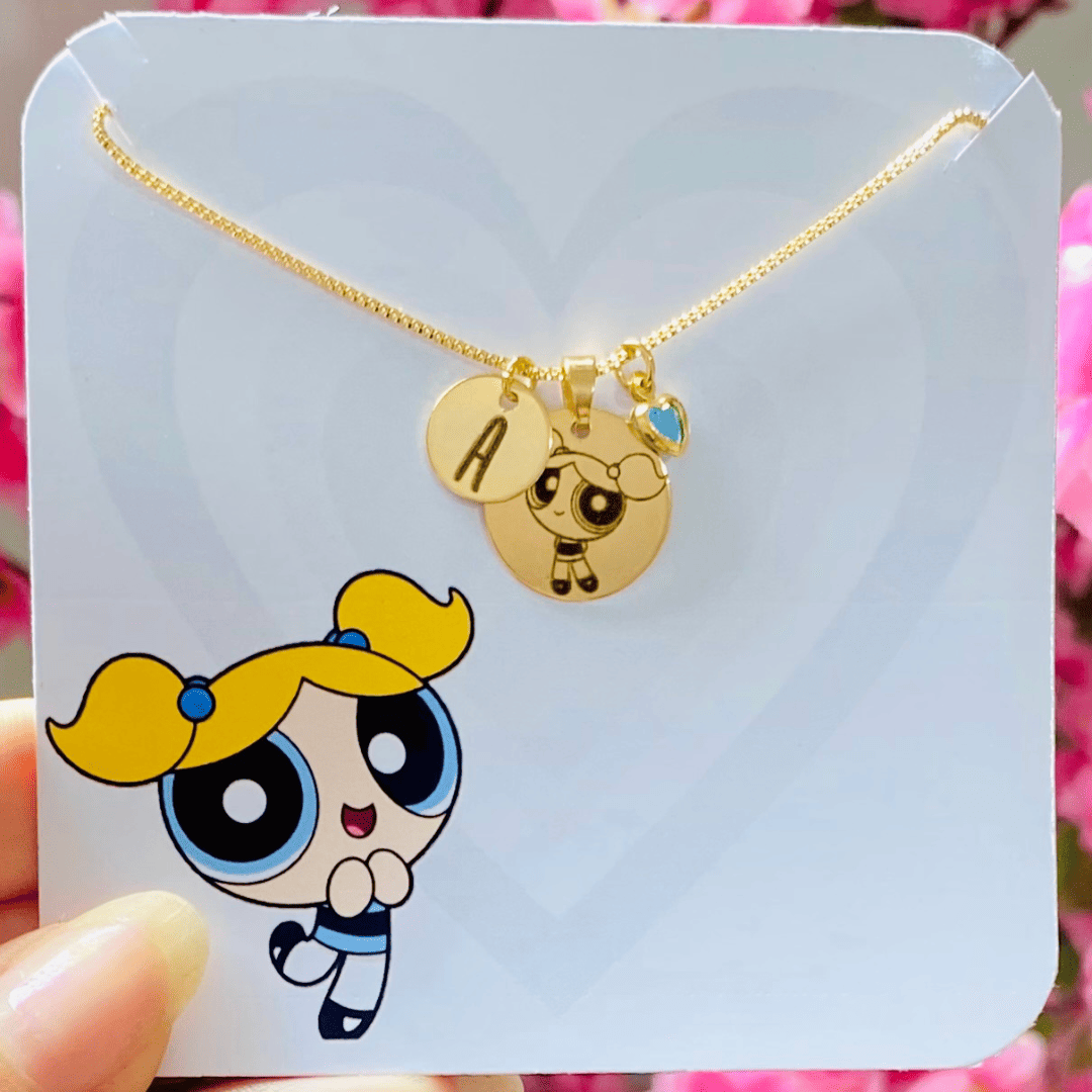 Colar veneziana banhado a ouro 18k (70 milésimos) + verniz italiano, com pingente de medalhinha gravada a laser imagem da lindinha super poderosa + inicial da sua escolha + coração azul.