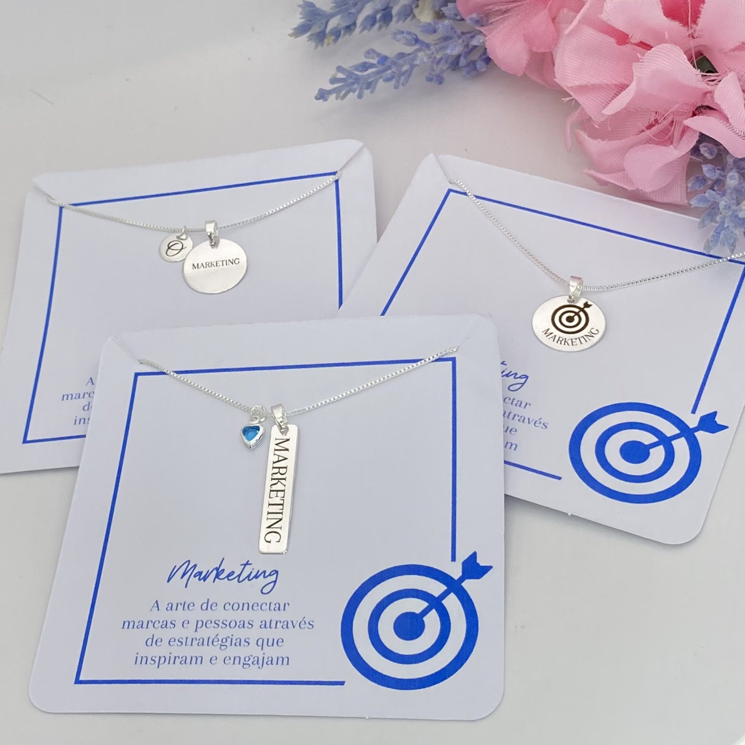 - plaquinha gravada a laser "marketing" + mini coração azul.