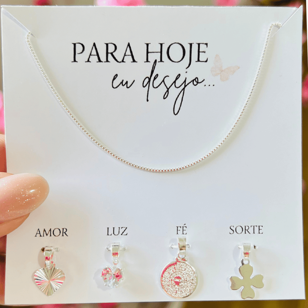 Colar veneziana multi-pingentes banhados a prata 925 (70 milésimos) + verniz italiano com pingentes de coração diamantado, coração 6mm de zircônia, trevo e medalha pai nosso.