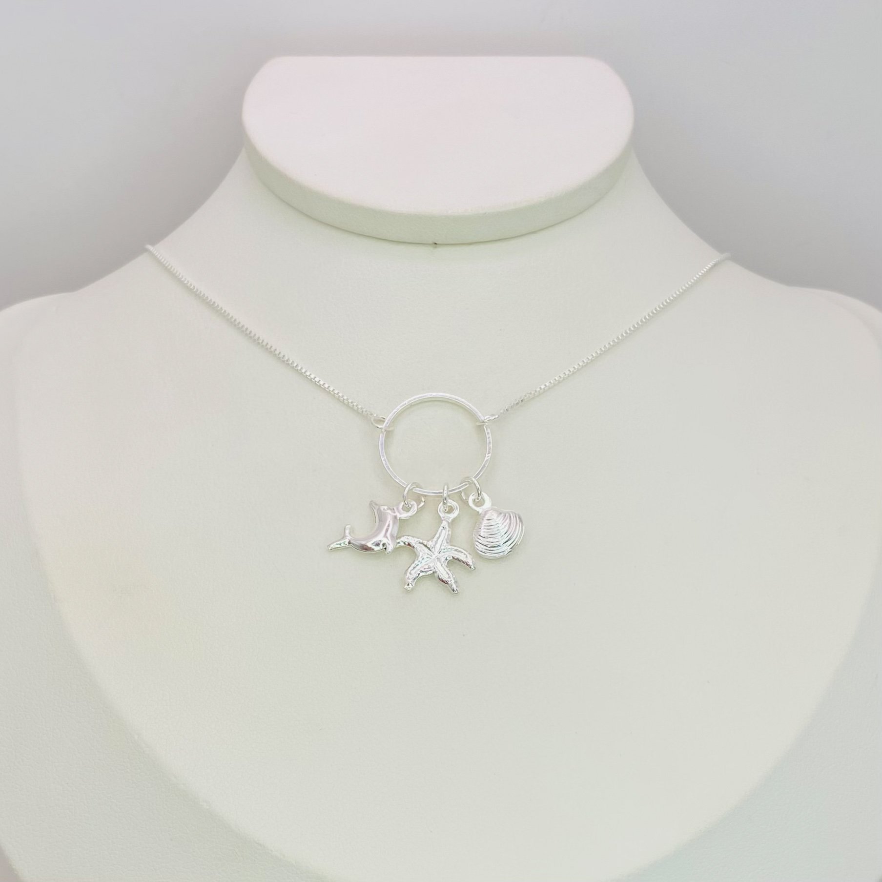 • Pingente central em argola, que reúne três mini pingentes encantadores: concha, golfinho e estrela-do-mar