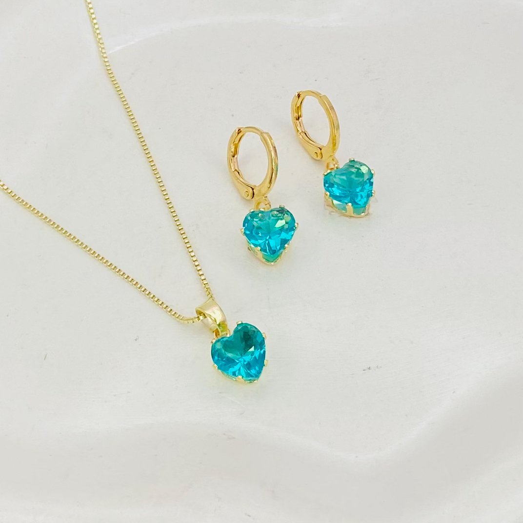 Conjunto coração azul royal Dourado ref 1032