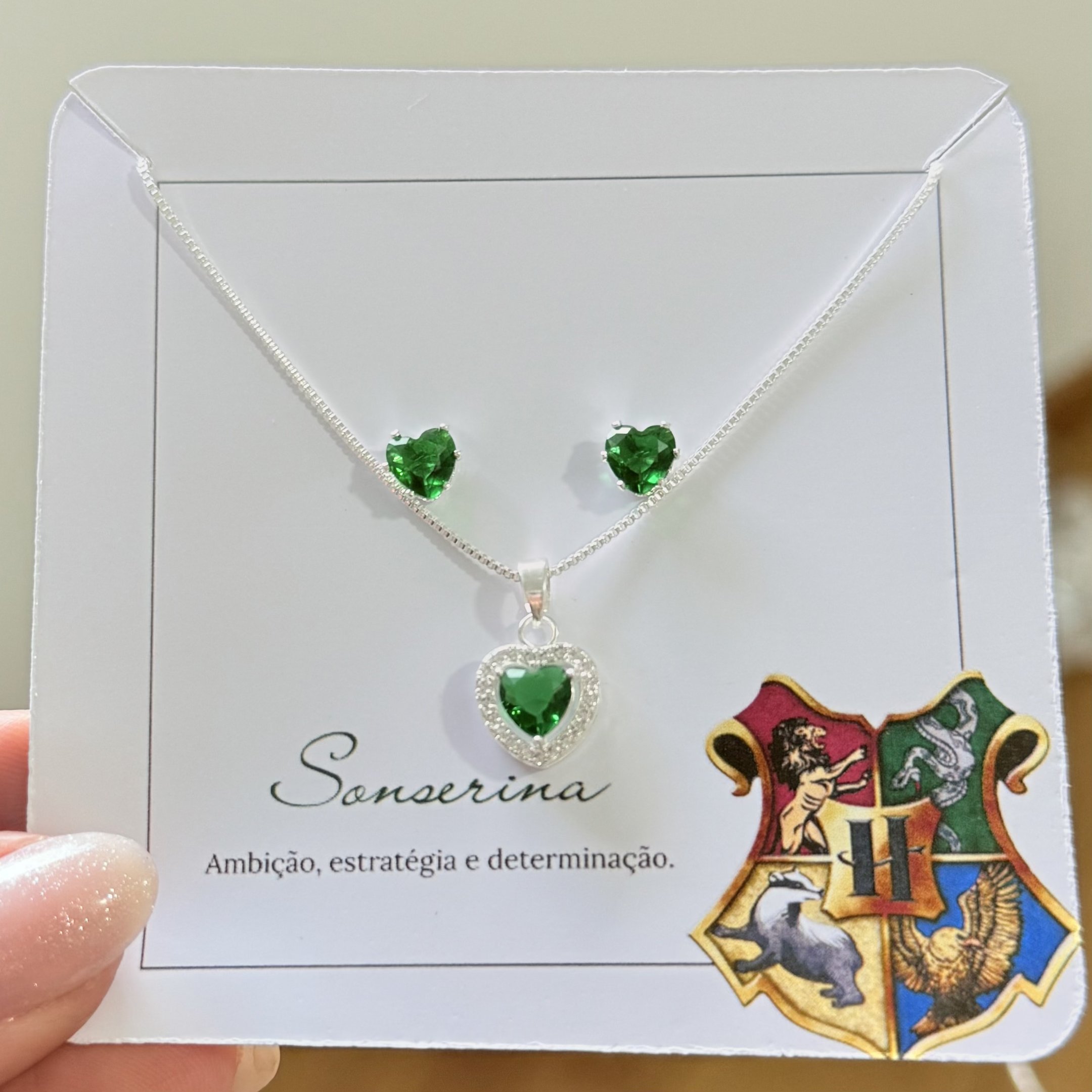 Inspirado na determinação da Sonserina, o coração 6mm em tom esmeralda simboliza estratégia, ambição e poder. Um conjunto elegante para quem sabe exatamente onde quer chegar.