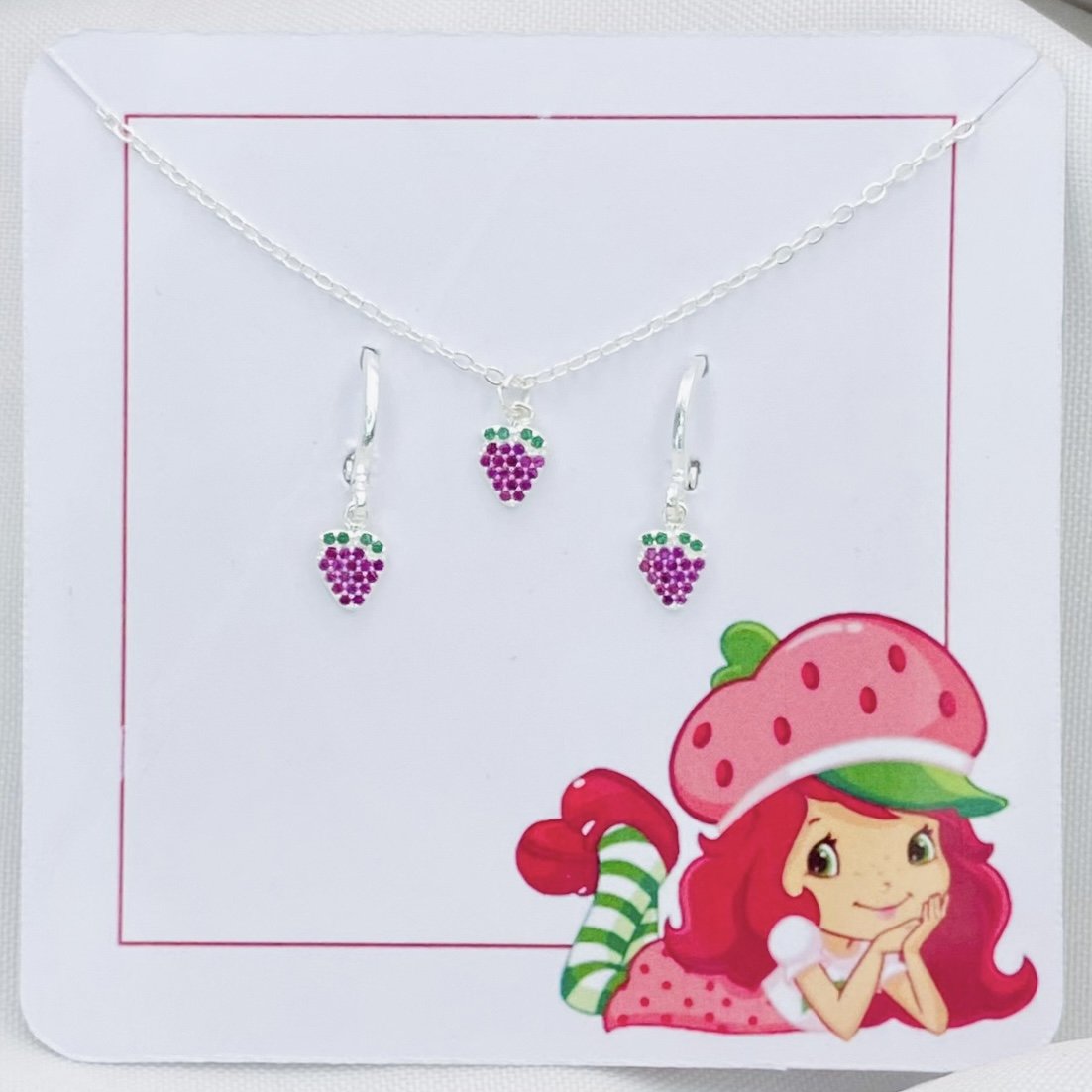 Conjunto brinco + colar cadeadinho banhados a prata 925 (70 milésimos) + verniz italiano, com pingente de morango cravejado com zircônia.Medida do colar: 35 cm + 5 cm de extensor.