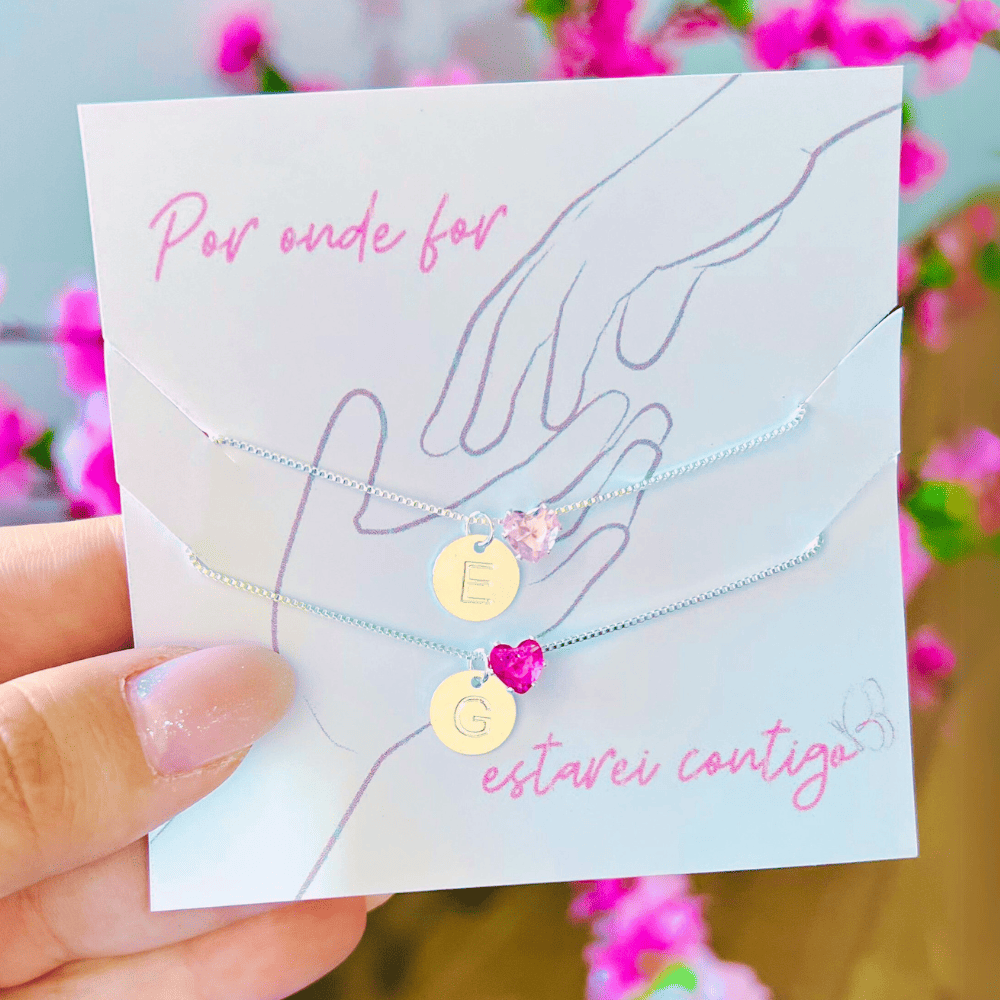 Kit com dois colares venezianas banhados a prata 925 (70 milésimos) + verniz italiano, com pingentes de coração 6mm rosa pink e rosa bebe + iniciais da sua escolha, ideal para presente de amigas.