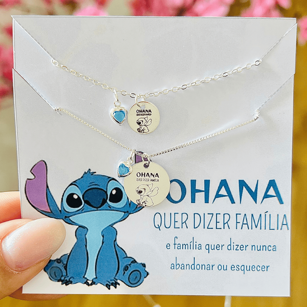 Kit 2 colares (1 infantil + 1 adulto) banhados a prata 925 (70 milésimos) + verniz italiano, com pingente de medalhinha Stitch escrito "Ohana quer dizer familia" + pingente coração azul